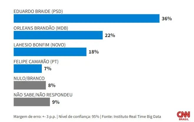 O atual prefeito de São Luís, Eduardo Braide (PSD), surge como o franco favorito na simulação, liderando com 36% das intenções de voto. Já Orleans Brandão (MDB) aparece com 22%, uma desvantagem de 14 pontos percentuais em relação a Braide.