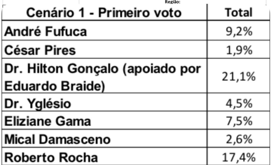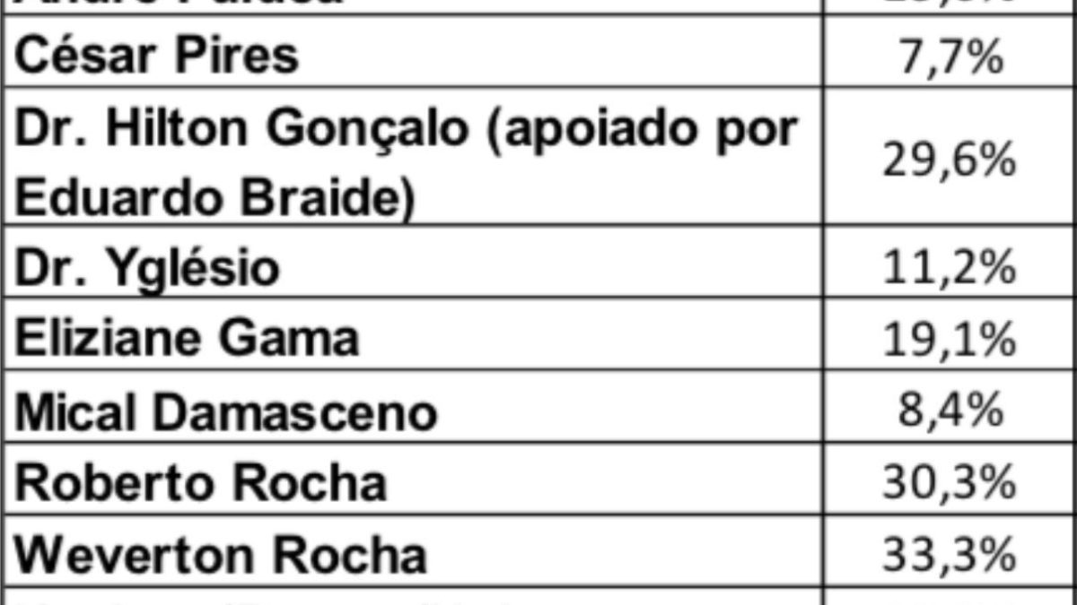 Na soma de primeiro + segundo voto, que indica o real potencial eleitoral, Hilton atinge 29,6%, ficando tecnicamente empatado com os líderes Weverton Rocha (33,3%) e Roberto Rocha (30,3%). Os demais candidatos aparecem bem atrás.
