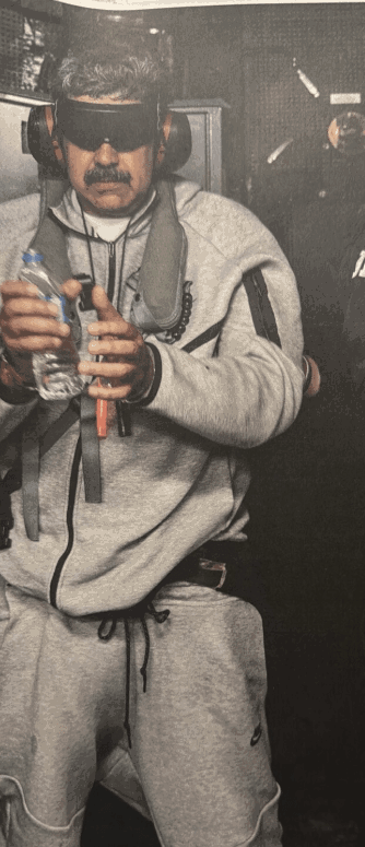 A imagem divulgada mostra um homem que se assemelha a Nicolás Maduro com algemas, aparentemente vendado e escoltado por militares, em um ambiente que Trump afirma ser o navio de guerra americano USS Iwo Jima.